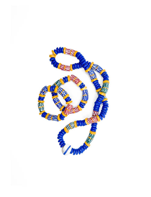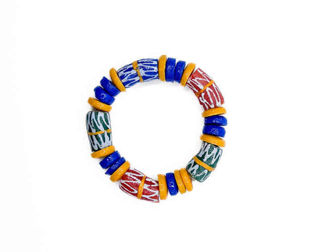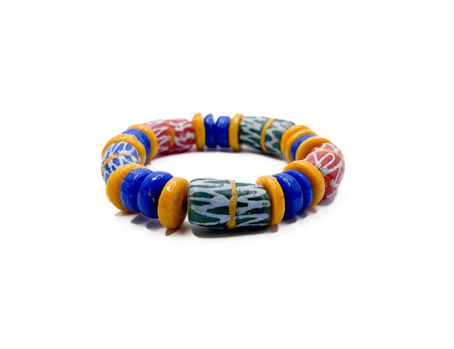 A stylish handmade Ghanaian jewellery set for men, featuring a matching necklace and mixed glass bead bracelets crafted from recycled glass beads sourced from Ghana. This vibrant set adds a bold, colourful touch to your style, and slight natural variations from the recycled materials enhance its unique charm and craftsmanship.