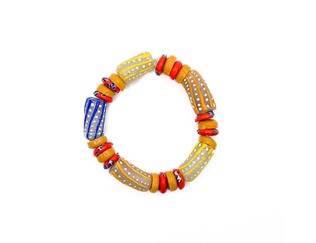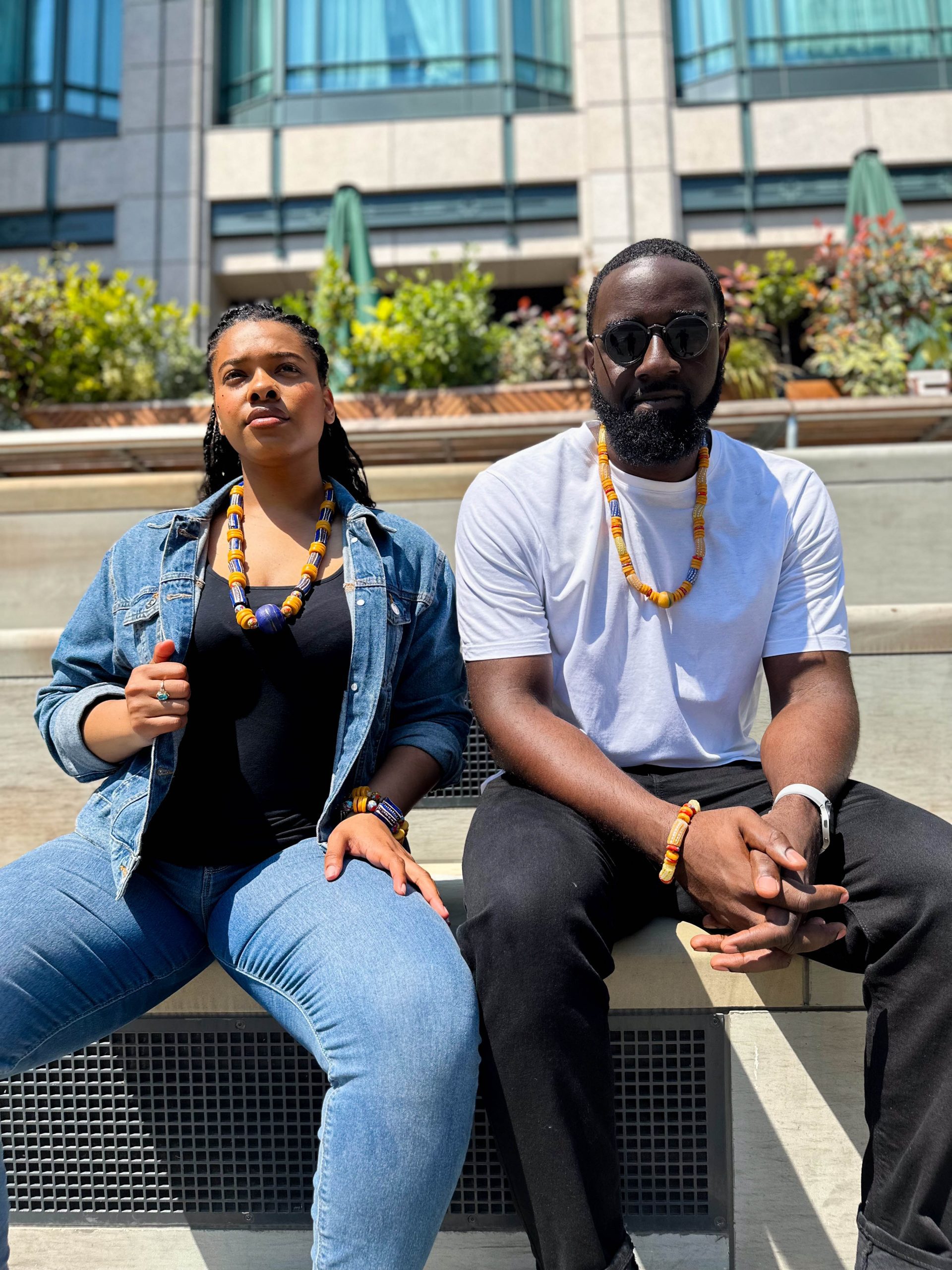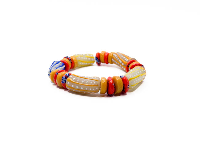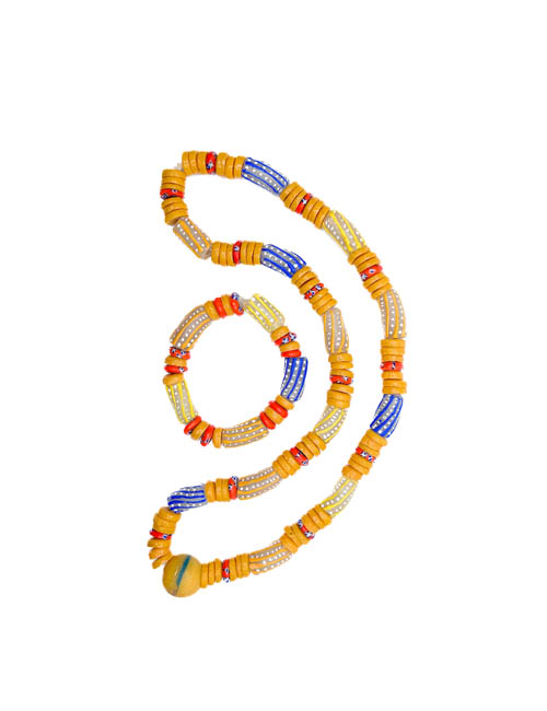 Vibrant unisex beaded jewellery set showcasing authentic Ghanaian craftsmanship. Necklace and bracelet made from recycled, colourful glass beads, each with unique natural variations. Perfect for style or gifting.