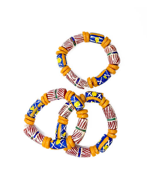 Set of three handmade Ghanaian glass bead bracelets for women, perfect for layering and adding a unique, stylish touch.